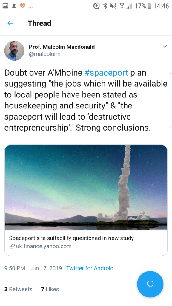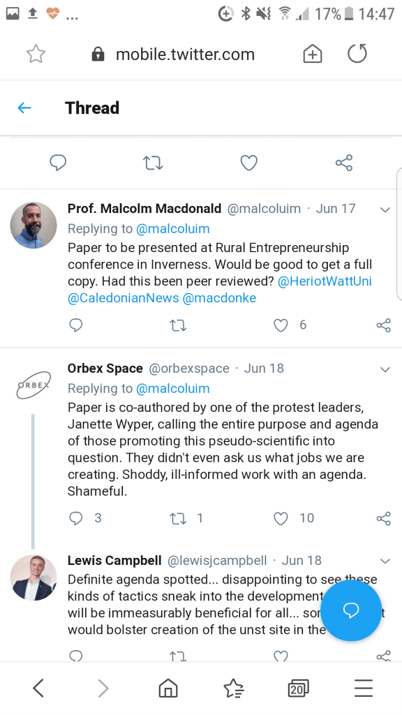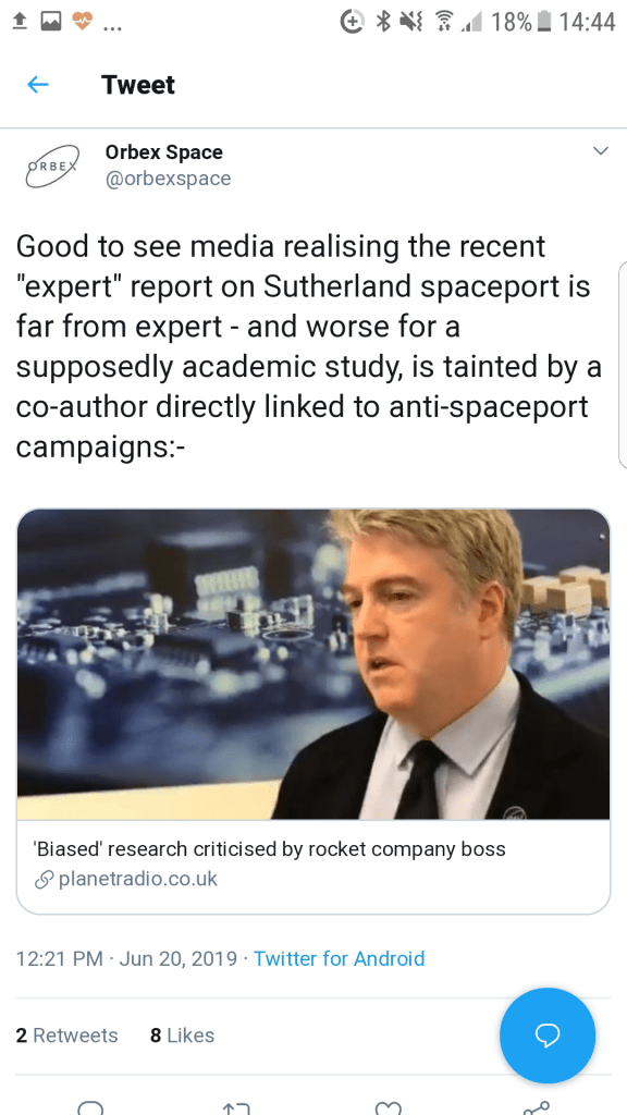 Experts from Heriot Watt and Glasgow Caledonian Universities, who were both quoted in the article came under fire from Orbex Ltd, one of the company’s that have been in receipt of government funding to support the provision of launch services. Orbex let loose on twitter with a number of attacks when another potential launch site started to share the news.