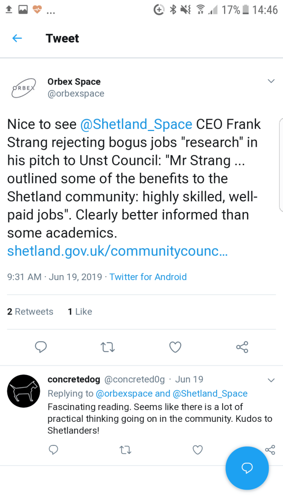 The Scottish academics spoke out against the Sutherland site and suggested that other options were likely to make more sense. A site in the Shetlands has been punting its wares for some time and seems to have the support of the University academics for a number of reasons.